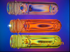在白光灯下,这种图案是由彩色波纹组成,而彩色的图案是应力作用产生的,从被测样品的图案差别可以观测出两种主要应力。